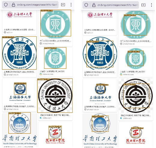 图:左:标注了完整校徽的识别效果;右:仅标注校徽中间部分的识别效果。实际照片的置信度较截图低。